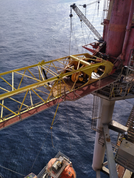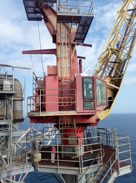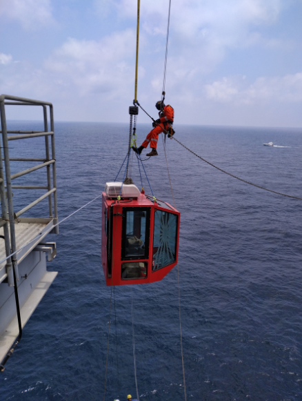 To address this challenge, Conbit utilized a modular lifting system, manually erected at the crane cabin access platform. This system enabled the safe lifting of the crane cabin over the edge of the platform. Once the cabin was positioned over the side, the load was transferred to a lift line connected to the crane boom. A second lift line, also attached to the crane boom, facilitated the horizontal movement of the crane cabin until it reached the designated laydown area.