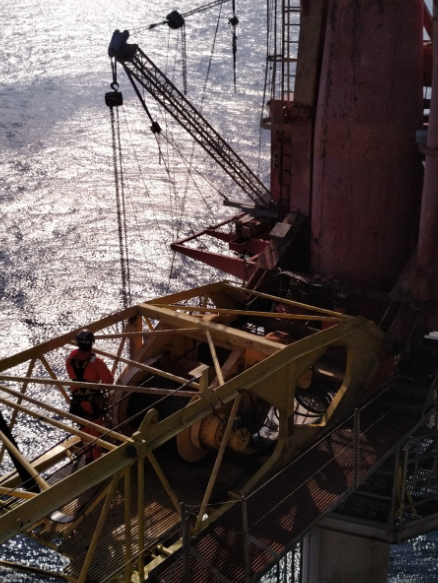 The crane cabin, weighing 3,000 lbs, is positioned more than 65.6 ft above the main deck. To successfully lower it to the laydown area, the cabin needs to be moved approximately 32.8 ft horizontally. Due to its location, no regular crane can access the crane cabin, posing a unique challenge for the Conbit team.